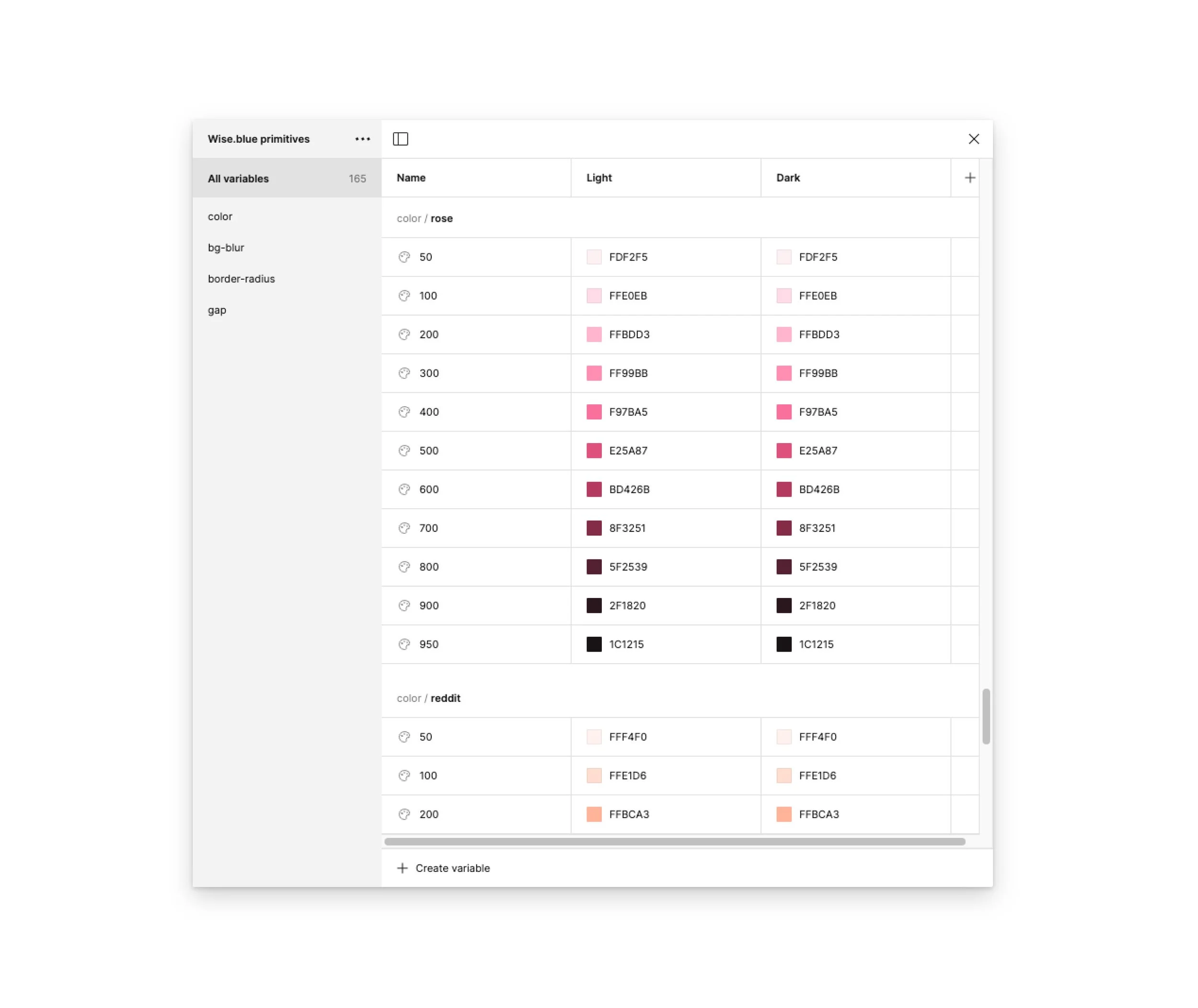 The design system is supported by variables, starting with primitives at the base layer, to which semantic tokens are connected. This ensures consistency throughout the system while also supporting quick adjustments when needed.