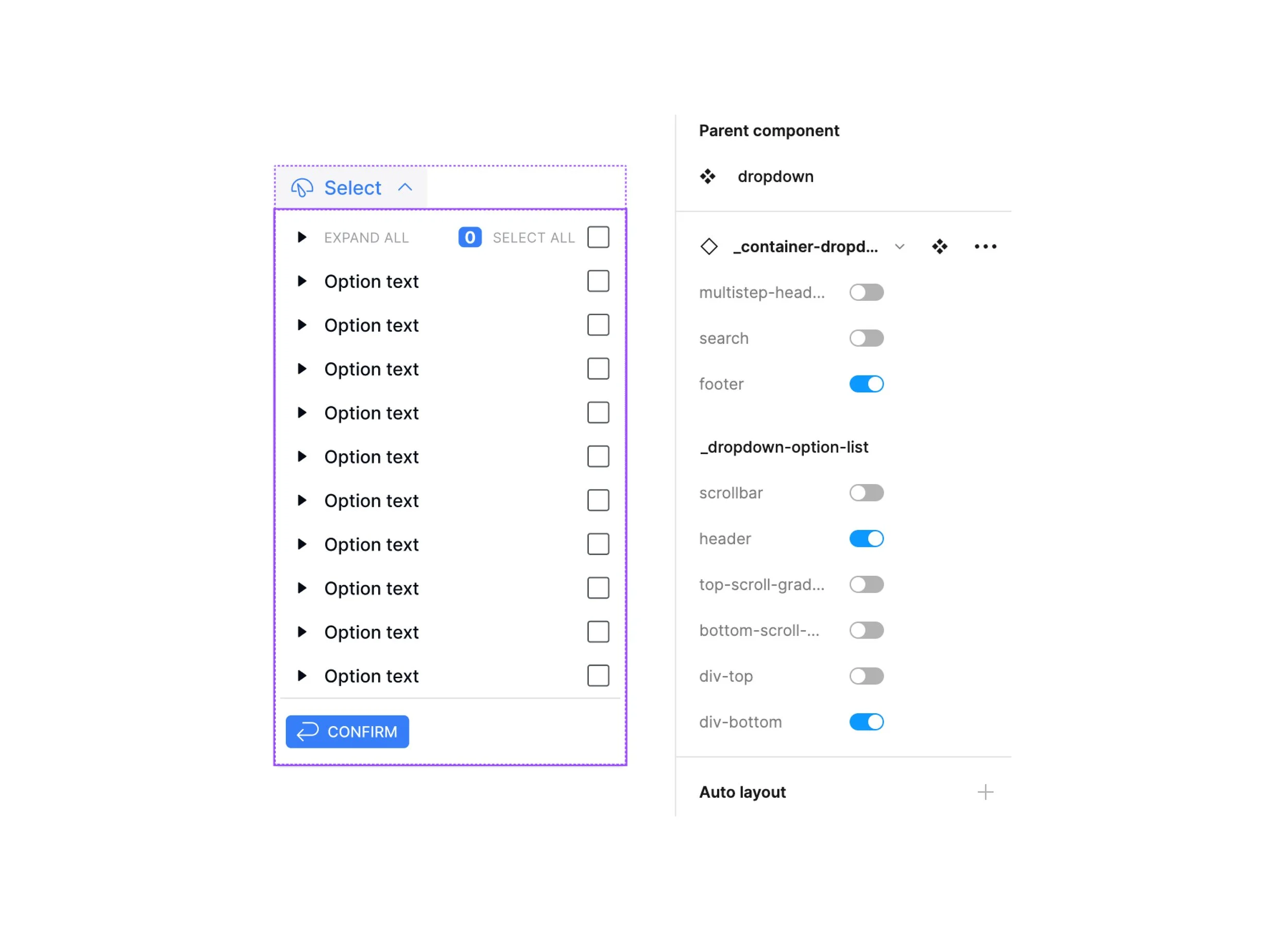 While the bento boxes ensure that the DS is easily scannable, the components are built to be highly customizable and allow designers to achieve the intended result directly via the properties panel.